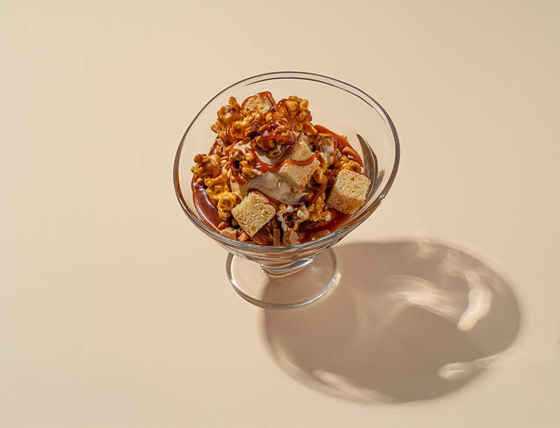 Banana, fresh berries, lotus crumbs, vanilla ice cream, warm Dulce de Leche sauce