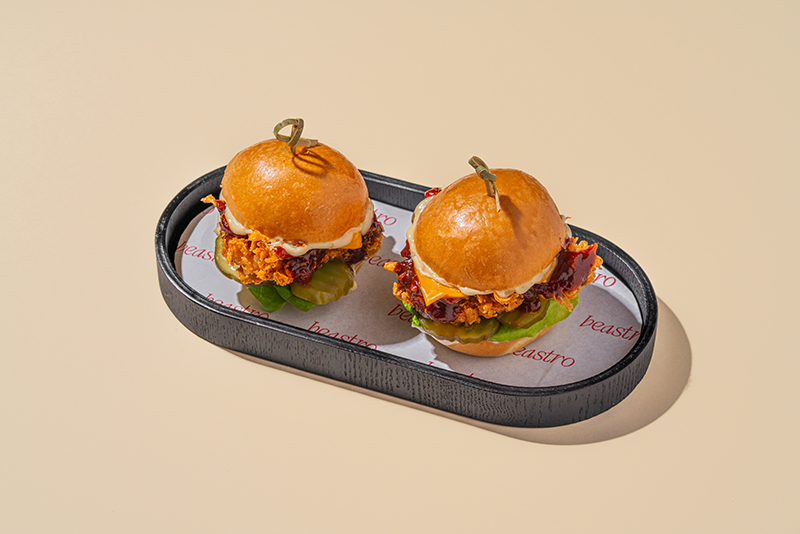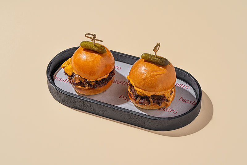 2 Angus beef double patty sliders, cheddar, house sauce, toasted potato bun, grilled onions, corniche