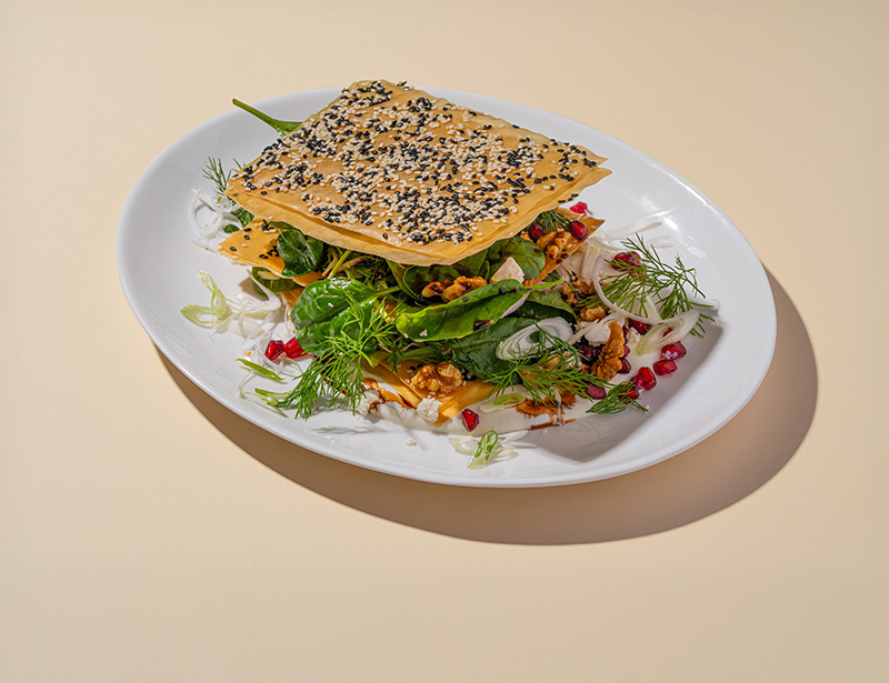 Whipped feta, baby spinach, red onion, pomegranate, walnut, lemon truffle vinaigrette
