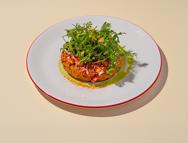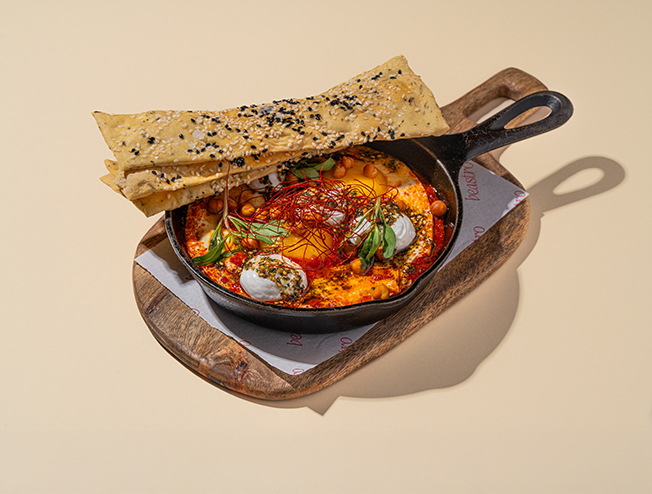 Spicy slow cooked tomatoes and peppers, eggs, labneh, crunchy chickpeas, sesame cracker bread