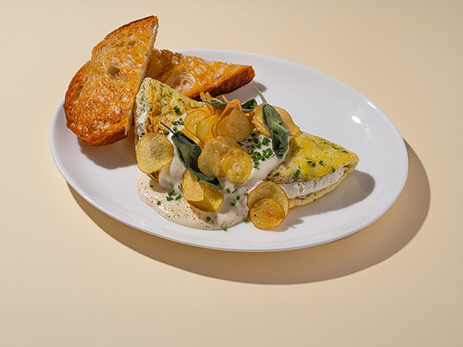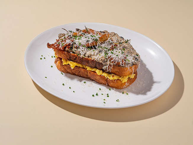 Soft scrambled eggs, truffle mushroom duxelles, fried oyster mushrooms, parmigiano, toasted sourdough