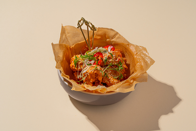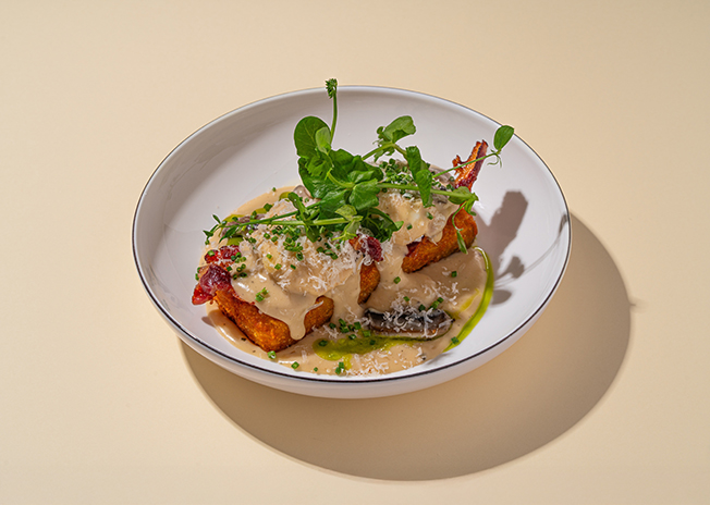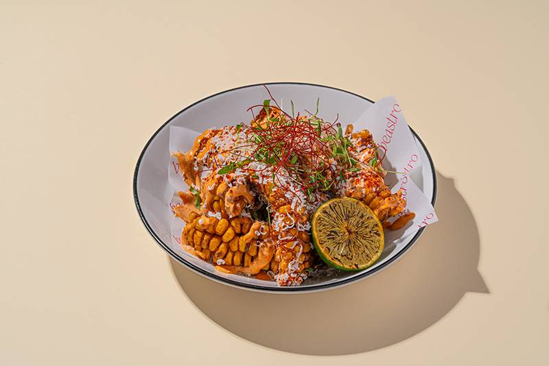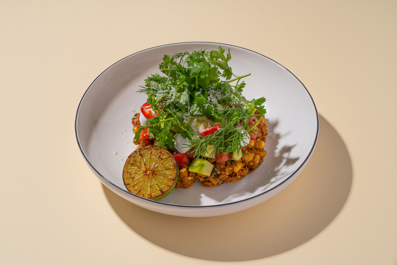 Crispy tempura corn, tomato salsa, poached egg, sour cream, avocado hollandaise, parmigiano