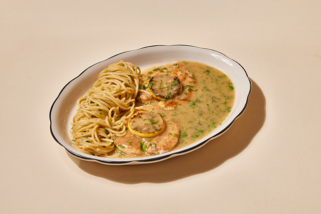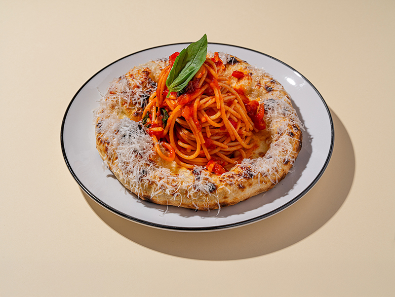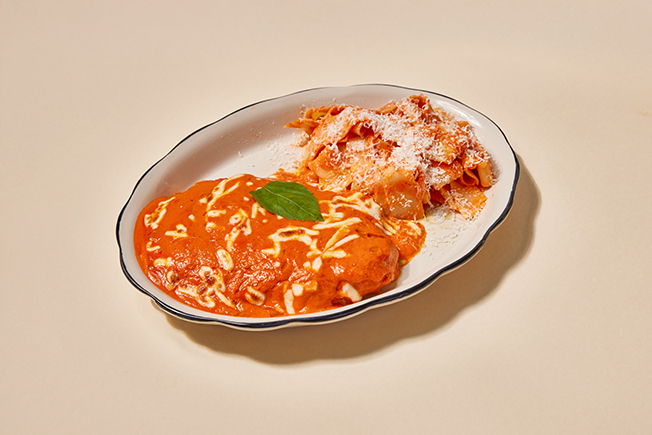 Breaded chicken breast covered in spicy creamy tomato sauce, pappardelle, mozzarella, parmigiano