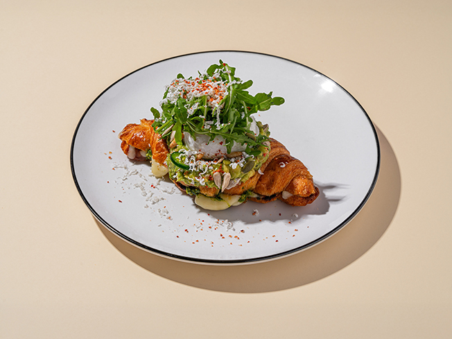 Grilled cheese croissant, coriander pesto, guacamole, poached egg, jalapeño, arugula, ricotta salata