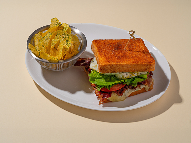 Crispy beef bacon, lettuce, tomato, roasted garlic basil mayonnaise, swiss cheese, toasted japanese milk bread, fried egg