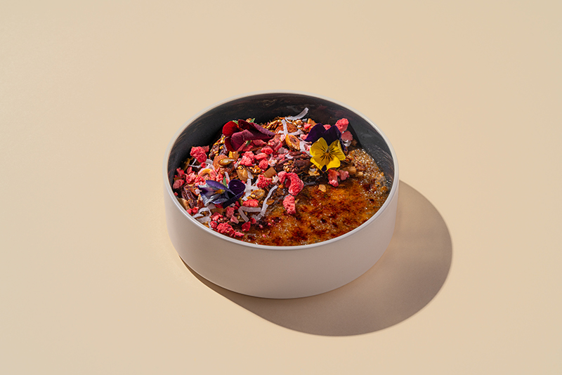 Coconut chia pudding, banana, dates, pecan-coconut granola, orange marmalade, freeze dried strawberry