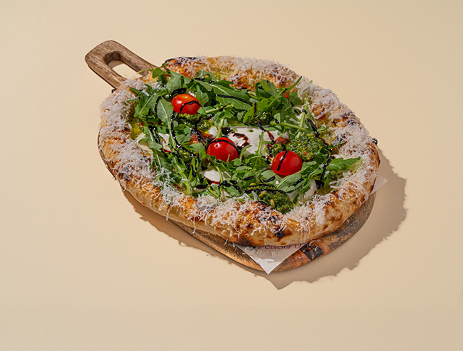 Confit cherry tomatoes, coriander pesto, balsamic glaze, parmigiano, rocca