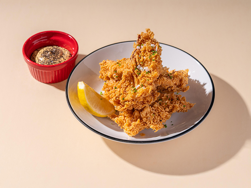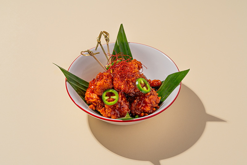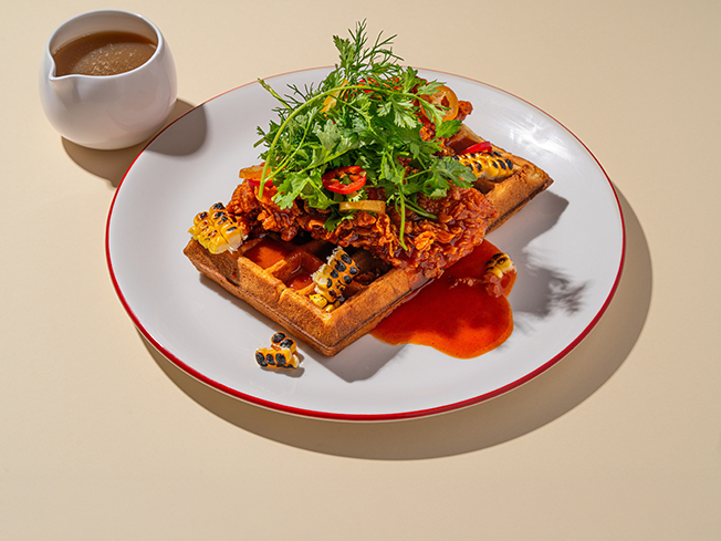 Belgian waffle, honey-buffalo glazed fried chicken, grilled corn, pickled kumquats, coriander, warm house syrup