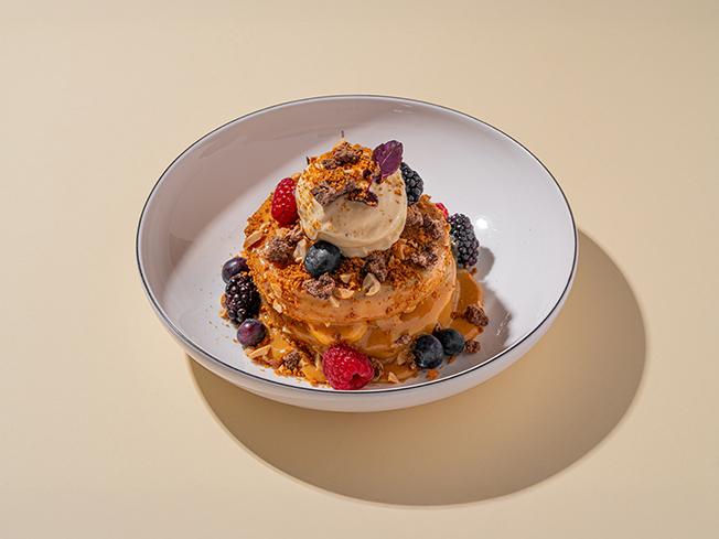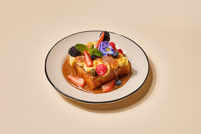 Japanese milk bread soaked in custard, vanilla crème, caramel brulee sauce, fresh berries