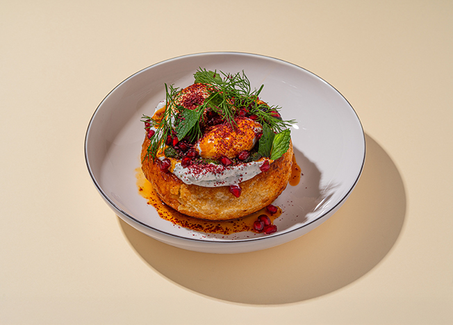 Poached eggs, browned Aleppo butter, garlic-dill labneh, zhoug, pomegranate seeds, fried flatbread