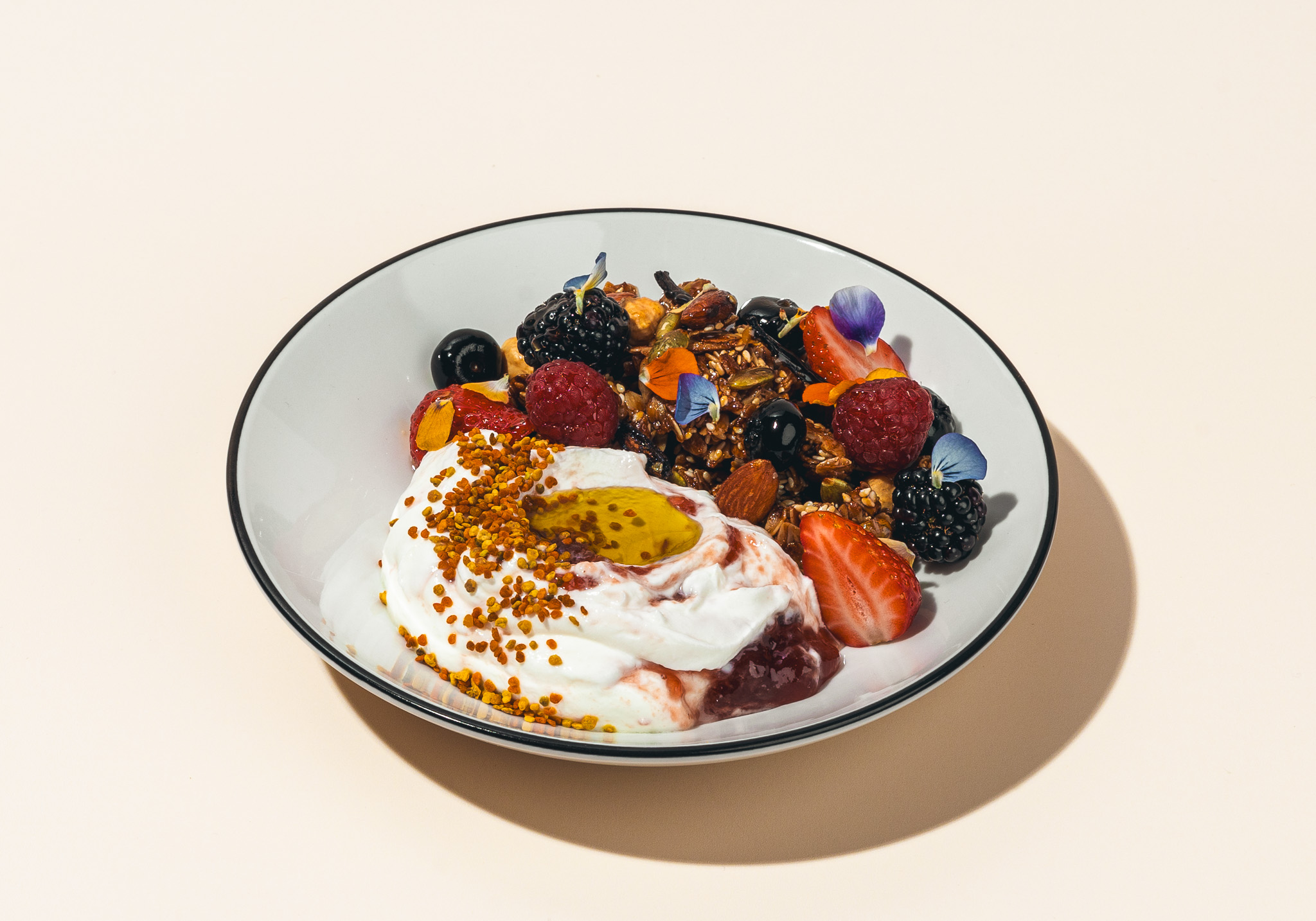 Parfait honey-olive oil-vanilla granola, greek yogurt, strawberry compote, fresh berries, bee pollen
