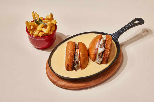 180 g Angus beef patty, Swiss cheese, pickle, sauce Américaine, toasted brioche bun, frites, sizzling cheese sauce