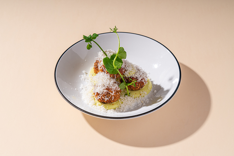 Creamy burrata, yellow orange beet, local green beans, maple balsamic vinaigrette, micro greens, parmesan crunch