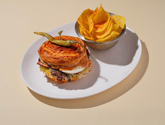 Angus beef patty, pastrami, swiss cheese, sauerkraut, fried egg, pickles, special sauce, croissant bun