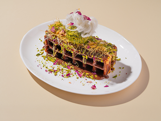Belgium waffle, crispy kataifi, pistachio cream, vanilla ice cream, warm chocolate sauce